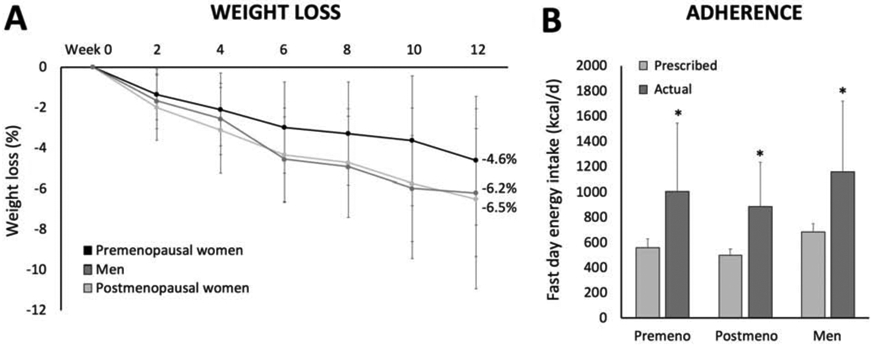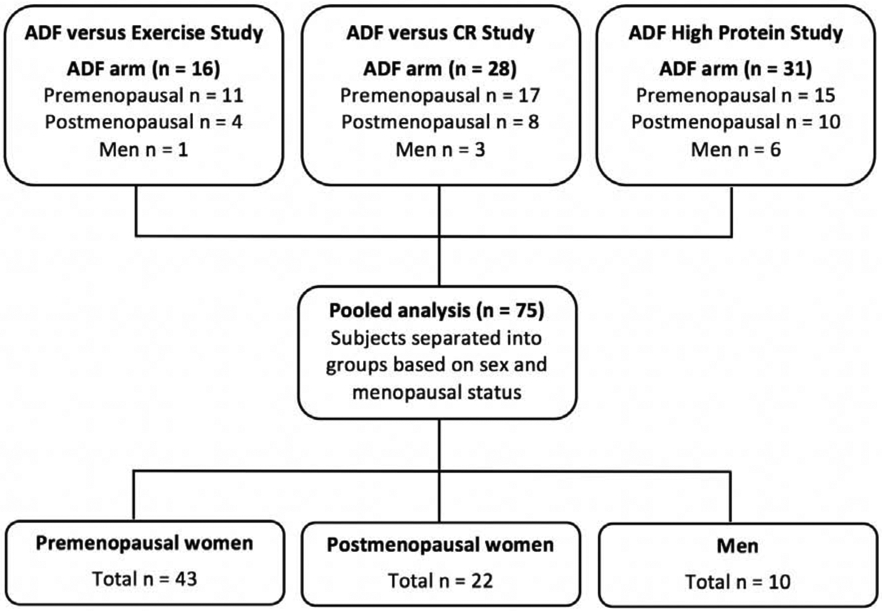 Methods and results: This secondary analysis pooled the data of men and women (n = 75) who participated in three 12-week ADF studies (500 kcal fast day; alternated with an ad libitum intake feast day). Body weight decreased in premenopausal women (-4.6 ± 3.2%), postmenopausal women (-6.5 ± 3.2%) and men (-6.2 ± 4.4%) (main effect of time, P < 0.001), with no difference between groups (no group × time interaction). Energy intake on fast days was higher than prescribed in all groups (∼400-500 excess kcal consumed), with no differences between groups. Fat mass, lean mass, fasting insulin, and insulin resistance, and blood pressure decreased similarly in all groups (main effect of time, P < 0.05 for all comparisons). LDL cholesterol decreased more in postmenopausal versus premenopausal women (group × time interaction, P = 0.01). Fasting glucose, HDL cholesterol, and triglycerides remained unchanged in all groups.