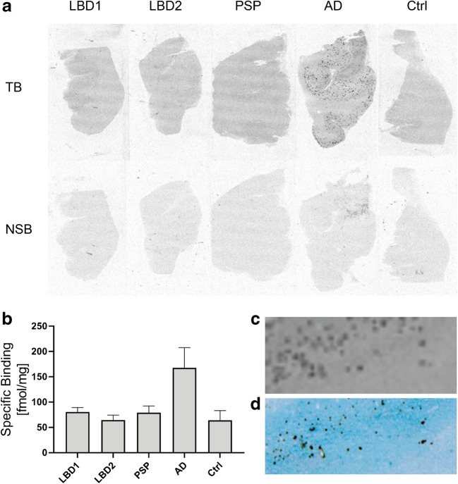 Methods: Specificity and selectivity of [3H]MODAG-001 were tested in in vitro binding assays using recombinant fibrils. After carbon-11 radiolabeling, the pharmacokinetic and metabolic profile was determined in mice. Specific binding was quantified in rats, inoculated with αSYN fibrils and using in vitro autoradiography in human brain sections of Lewy body dementia (LBD) cases provided by the Neurobiobank Munich (NBM).