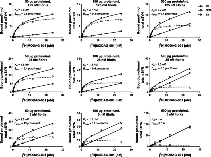 Results: [3H]MODAG-001 revealed a very high affinity towards pure αSYN fibrils (Kd = 0.6 ± 0.1 nM) and only a moderate affinity to hTau46 fibrils (Kd = 19 ± 6.4 nM) as well as amyloid-β1-42 fibrils (Kd = 20 ± 10 nM). [11C]MODAG-001 showed an excellent ability to penetrate the mouse brain. Metabolic degradation was present, but the stability of the parent compound improved after selective deuteration of the precursor. (d3)-[11C]MODAG-001 binding was confirmed in fibril-inoculated rat striata using in vivo PET imaging. In vitro autoradiography showed no detectable binding to aggregated αSYN in human brain sections of LBD cases, most likely, because of the low abundance of aggregated αSYN against background protein.