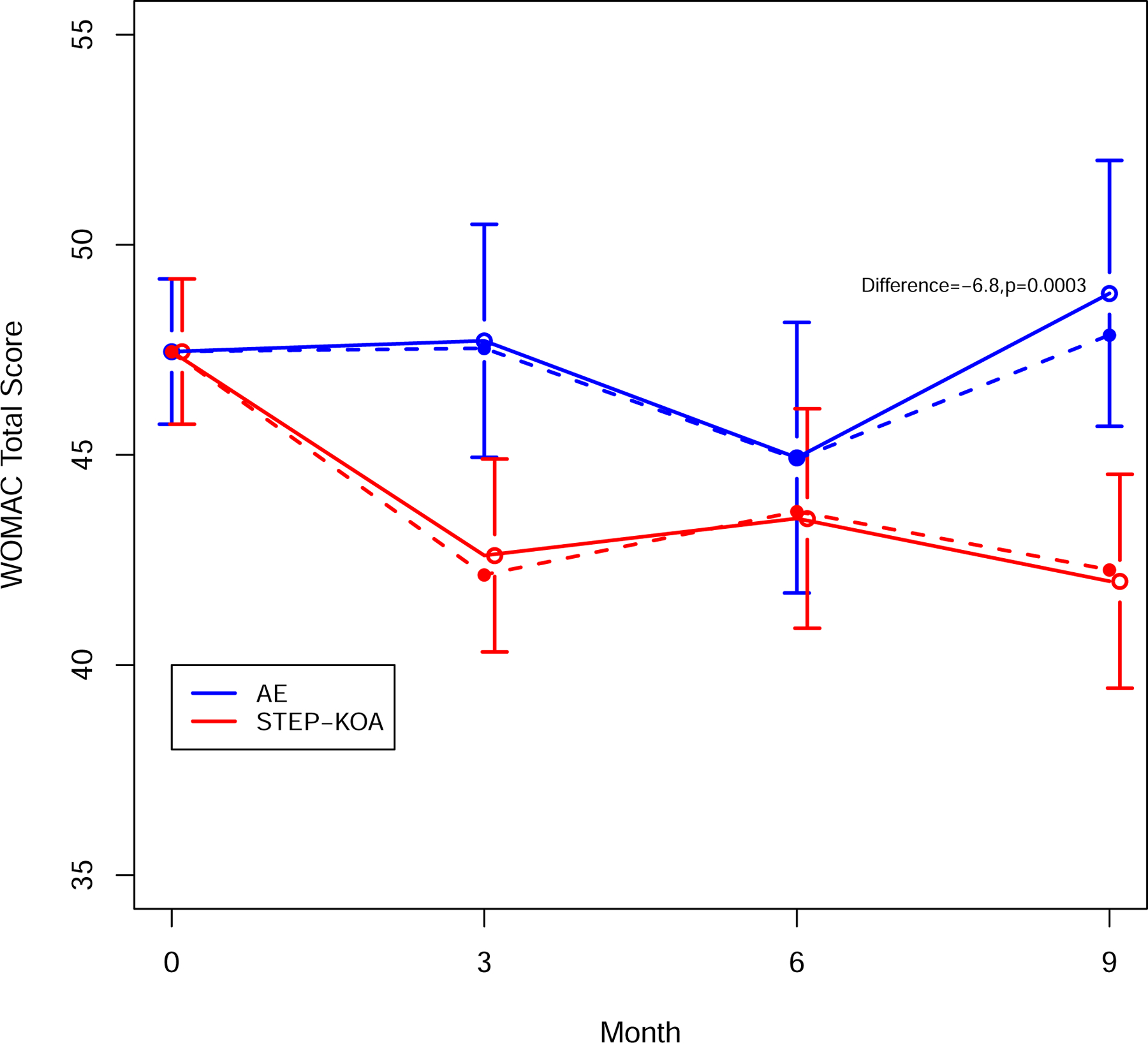 Measurements: Primary outcome was Western Ontario and McMaster Universities Osteoarthritis Index (WOMAC) score. Scores for the STEP-KOA and AE groups at 9 months were compared by using linear mixed models.