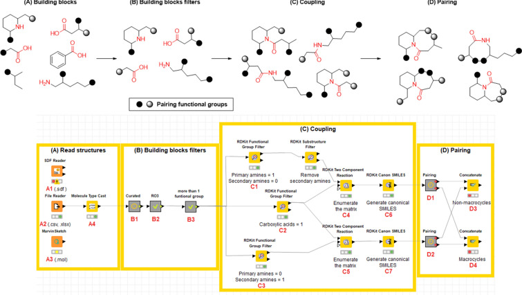 Keywords: Chemical enumeration; Chemoinformatics; Combinatorial libraries; DOS synthesis; Drug design; Education; KNIME; Python.
