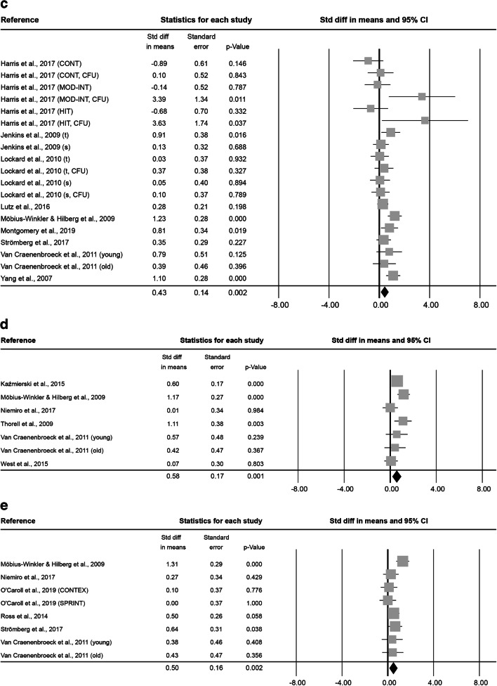 Despite of the increasing number of investigations on the effects of acute exercise on circulating stem and progenitor cell (SC) numbers, and in particular on respective subgroups, i.e. endothelial (ESC), hematopoietic (HSC), and mesenchymal (MSC) stem and progenitor cells, a consensus regarding mechanisms and extent of these effects is still missing. The aim of this meta-analysis was to systematically evaluate the overall-effects of acute exercise on the different SC-subgroups and investigate possible subject- and intervention-dependent factors affecting the extent of SC-mobilization in healthy humans. Trials assessing SC numbers before and at least one timepoint after acute exercise, were identified in a systematic computerized search. Compared to baseline, numbers were significantly increased for early and non-specified SCs (enSCs) until up to 0.5 h after exercise (0-5 min: +0.64 [Standardized difference in means], p < 0.001; 6-20 min: +0.42, p < 0.001; 0.5 h: +0.29, p = 0.049), for ESCs until 12-48 h after exercise (0-5 min: +0.66, p < 0.001; 6-20 min: +0.43 p < 0.001; 0.5 h: +0.43, p = 0.002; 1 h: +0.58, p = 0.001; 2 h: +0.50, p = 0.002; 3-8 h: +0.70, p < 0.001; 12-48 h: +0.38, p = 0.003) and for HSCs at 0-5 min (+ 0.47, p < 0.001) and at 3 h after exercise (+ 0.68, p < 0.001). Sex, intensity and duration of the intervention had generally no influence. The extent and kinetics of the exercise-induced mobilization of SCs differ between SC-subpopulations. However, also definitions of SC-subpopulations are non-uniform. Therefore, finding a consensus with a clear definition of cell surface markers defining ESCs, HSCs and MSCs is a first prerequisite for understanding this important topic.