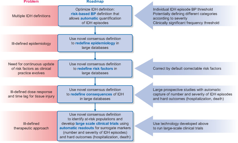 Intradialytic hypotension (IDH) is a frequent and serious complication of chronic haemodialysis, linked to adverse long-term outcomes including increased cardiovascular and all-cause mortality. IDH is the end result of the interaction between ultrafiltration rate (UFR), cardiac output and arteriolar tone. Thus excessive ultrafiltration may decrease the cardiac output, especially when compensatory mechanisms (heart rate, myocardial contractility, vascular tone and splanchnic flow shifts) fail to be optimally recruited. The repeated disruption of end-organ perfusion in IDH may lead to various adverse clinical outcomes affecting the heart, central nervous system, kidney and gastrointestinal system. Potential interventions to decrease the incidence or severity of IDH include optimization of the dialysis prescription (cool dialysate, UFR, sodium profiling and high-flux haemofiltration), interventions during the dialysis session (midodrine, mannitol, food intake, intradialytic exercise and intermittent pneumatic compression of the lower limbs) and interventions in the interdialysis period (lower interdialytic weight gain and blood pressure-lowering drugs). However, the evidence base for many of these interventions is thin and optimal prevention and management of IDH awaits further clinical investigation. Developing a consensus definition of IDH will facilitate clinical research. We review the most recent findings on risk factors, pathophysiology and management of IDH and, based on this, we call for a new consensus definition of IDH based on clinical outcomes and define a roadmap for IDH research.