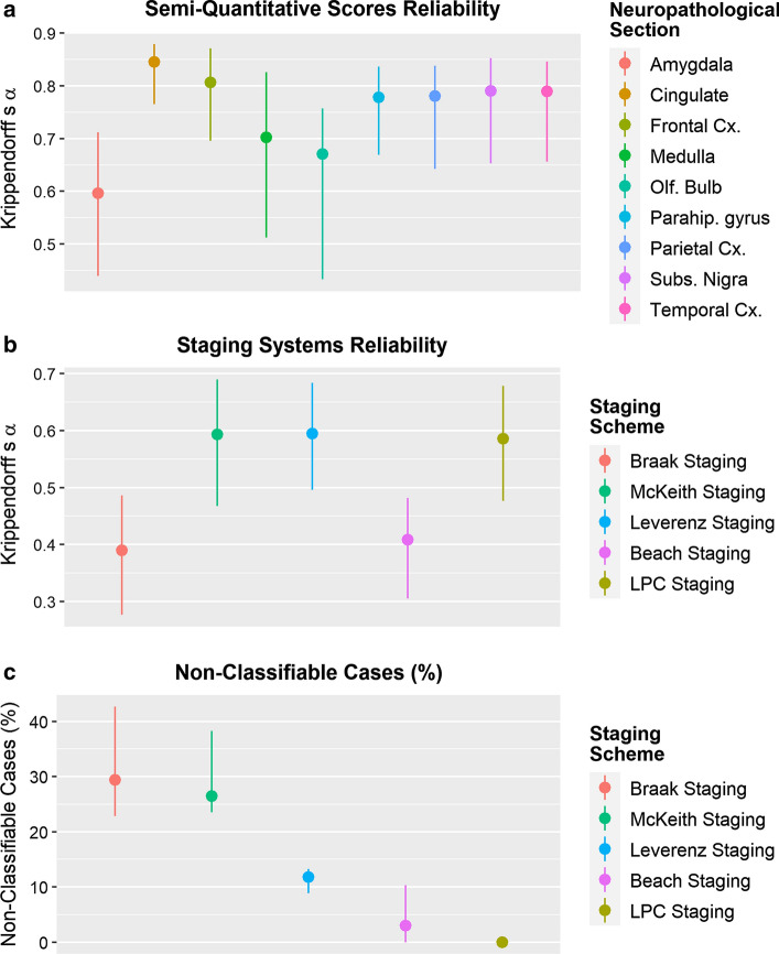 Currently, the neuropathological diagnosis of Lewy body disease (LBD) may be stated according to several staging systems, which include the Braak Lewy body stages (Braak), the consensus criteria by McKeith and colleagues (McKeith), the modified McKeith system by Leverenz and colleagues (Leverenz), and the Unified Staging System by Beach and colleagues (Beach). All of these systems use semi-quantitative scoring (4- or 5-tier scales) of Lewy pathology (LP; i.e., Lewy bodies and Lewy neurites) in defined cortical and subcortical areas. While these systems are widely used, some suffer from low inter-rater reliability and/or an inability to unequivocally classify all cases with LP. To address these limitations, we devised a new system, the LP consensus criteria (LPC), which is based on the McKeith system, but applies a dichotomous approach for the scoring of LP (i.e., "absent" vs. "present") and includes amygdala-predominant and olfactory-only stages. α-Synuclein-stained slides from brainstem, limbic system, neocortex, and olfactory bulb from a total of 34 cases with LP provided by the Newcastle Brain Tissue Resource (NBTR) and the University of Pennsylvania brain bank (UPBB) were scanned and assessed by 16 raters, who provided diagnostic categories for each case according to Braak, McKeith, Leverenz, Beach, and LPC systems. In addition, using LP scores available from neuropathological reports of LP cases from UPBB (n = 202) and NBTR (n = 134), JT (UPBB) and JA (NBTR) assigned categories according to all staging systems to these cases. McKeith, Leverenz, and LPC systems reached good (Krippendorff's α ≈ 0.6), while both Braak and Beach systems had lower (Krippendorff's α ≈ 0.4) inter-rater reliability, respectively. Using the LPC system, all cases could be unequivocally classified by the majority of raters, which was also seen for 97.1% when the Beach system was used. However, a considerable proportion of cases could not be classified when using Leverenz (11.8%), McKeith (26.5%), or Braak (29.4%) systems. The category of neocortical LP according to the LPC system was associated with a 5.9 OR (p < 0.0001) of dementia in the 134 NBTR cases and a 3.14 OR (p = 0.0001) in the 202 UPBB cases. We established that the LPC system has good reproducibility and allows classification of all cases into distinct categories. We expect that it will be reliable and useful in routine diagnostic practice and, therefore, suggest that it should be the standard future approach for the basic post-mortem evaluation of LP.