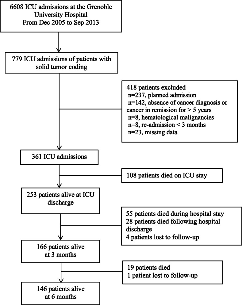 Methods: Based on the French OutcomeRea™ database, we included solid cancer patients discharged alive, between December 2005 and November 2013, from the medical ICU of the university hospital in Grenoble, France. Patient characteristics and outcome at 3 and 6 months following ICU discharge were extracted from available database.
