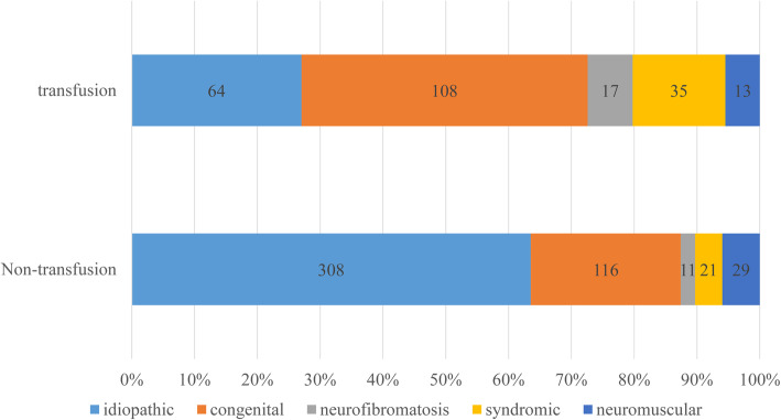 Background: To assess the risk factors for blood transfusion in a great number of adolescent cases with different types of scoliosis who received scoliosis surgery.