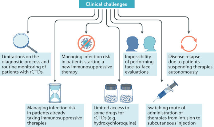 During the COVID-19 pandemic, the need to provide high-level care for a large number of patients with COVID-19 has affected resourcing for, and limited the routine care of, all other conditions. The impact of this health emergency is particularly relevant in the rare connective tissue diseases (rCTDs) communities, as discussed in this Perspective article by the multi-stakeholder European Reference Network on Rare and Complex Connective Tissue and Musculoskeletal Diseases (ERN ReCONNET). The clinical, organizational and health economic challenges faced by health-care providers, institutions, patients and their families during the SARS-CoV-2 outbreak have demonstrated the importance of ensuring continuity of care in the management of rCTDs, including adequate diagnostics and monitoring protocols, and highlighted the need for a structured emergency strategy. The vulnerability of patients with rCTDs needs to be taken into account when planning future health policies, in preparation for not only the post-COVID era, but also any possible new health emergencies.