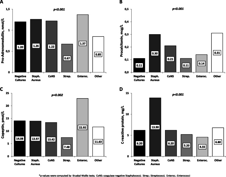 Results: Pro-ADM and copeptin were significantly higher in older patients and associated with prior chronic kidney disease. Pro-ADM was an independent predictor of hospital mortality (OR 3.29 [95%C.I. 1.04-11.5]; p = 0.042) whilst copeptin independently predicted 1-year mortality (OR 2.55 [95%C.I. 1.18-5.54]; p = 0.017). A high PCT value was strictly tied with S. aureus etiology (p = 0.001). CRP was the only biomarker associated with embolic events (p = 0.003).