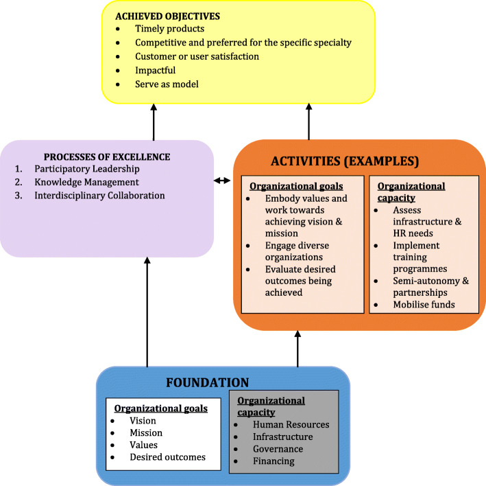 Results: We identified three key, synergistic processes of excellence central to institutionalizing academic CoEs: participatory leadership, knowledge management, and inter-disciplinary collaboration. (1) Participatory leadership encourages innovations to originate from the different parts of the organization, and facilitates ownership as well as a culture of excellence. (2) Centers of Excellence are future-oriented in that they are constantly seeking to achieve best practices, informed by the most up-to-date and cutting-edge research and information available. As such, the process by which centres facilitate the flow of knowledge within and outside the organization, or knowledge management, is critical to their success. (3) Such centres also rely on expertise from different disciplines and 'engaged' scholarship. This multidisciplinarity leads to improved research productivity and enhances the production of problem-solving innovations.
