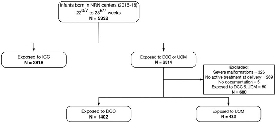 Objective: To compare in-hospital outcomes after umbilical cord milking vs delayed cord clamping among infants <29 weeks of gestation.