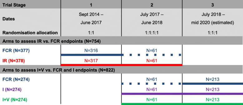 Methods: FLAIR was designed as a two-arm trial requiring 754 patients. In stage 2, two new arms were added: a new experimental arm and a second control arm to protect the trial in case of a change in practice. In stage 3, the original experimental arm was closed as its planned recruitment target was reached. In total, 1516 participants will be randomised to the trial.
