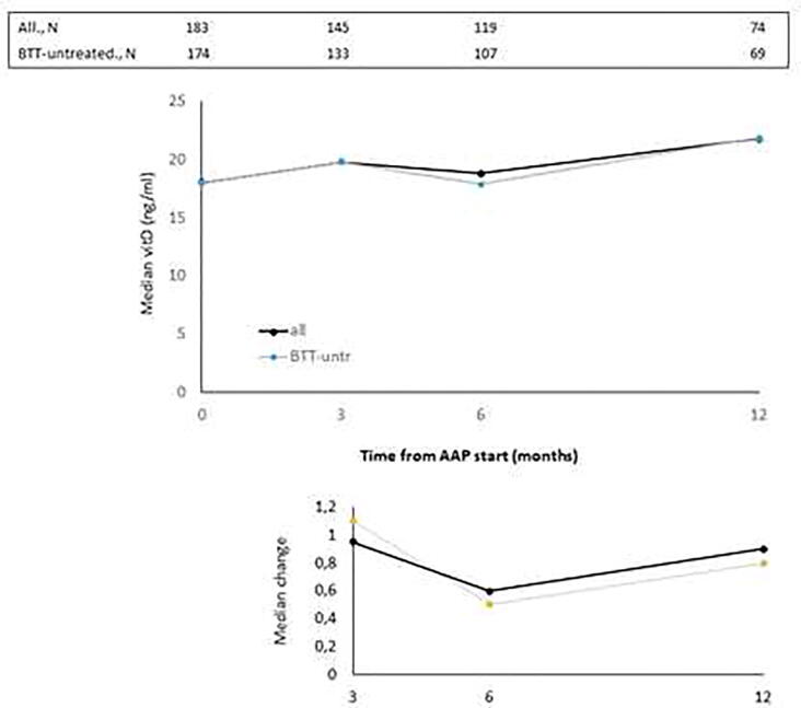 Methods: Patients were enrolled if a blood sample was obtained before the first administration of abiraterone (baseline); ad-hoc blood samples were withdrawn during routine tests after 3, 6, and 12 months. A centralized lab measured bone alkaline phosphatase (BALP, osteoblast activity marker), type-I collagen-C-telopeptide (CTX-1, bone resorption marker), parathyroid hormone (PTH) and vitamin D (vitD). At each time point, intra-patient variations vs baseline were compared by the signed-rank test (statistical significance: P-value < 0.05).