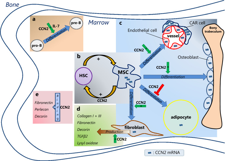 CCN2, formerly termed Connective Tissue Growth Factor, is a protein belonging to the Cellular Communication Network (CCN)-family of secreted extracellular matrix-associated proteins. As a matricellular protein it is mainly considered to be active as a modifier of signaling activity of several different signaling pathways and as an orchestrator of their cross-talk. Furthermore, CCN2 and its fragments have been implicated in the regulation of a multitude of biological processes, including cell proliferation, differentiation, adhesion, migration, cell survival, apoptosis and the production of extracellular matrix products, as well as in more complex processes such as embryonic development, angiogenesis, chondrogenesis, osteogenesis, fibrosis, mechanotransduction and inflammation. Its function is complex and context dependent, depending on cell type, state of differentiation and microenvironmental context. CCN2 plays a role in many diseases, especially those associated with fibrosis, but has also been implicated in many different forms of cancer. In the bone marrow (BM), CCN2 is highly expressed in mesenchymal stem/stromal cells (MSCs). CCN2 is important for MSC function, supporting its proliferation, migration and differentiation. In addition, stromal CCN2 supports the maintenance and longtime survival of hematopoietic stem cells, and in the presence of interleukin 7, stimulates the differentiation of pro-B lymphocytes into pre-B lymphocytes. Overexpression of CCN2 is seen in the majority of B-acute lymphoblastic leukemias, especially in certain cytogenetic subgroups associated with poor outcome. In acute myeloid leukemia, CCN2 expression is increased in MSCs, which has been associated with leukemic engraftment in vivo. In this review, the complex function of CCN2 in the BM microenvironment and in normal as well as malignant hematopoiesis is discussed. In addition, an overview is given of data on the remaining CCN family members regarding normal and malignant hematopoiesis, having many similarities and some differences in their function.