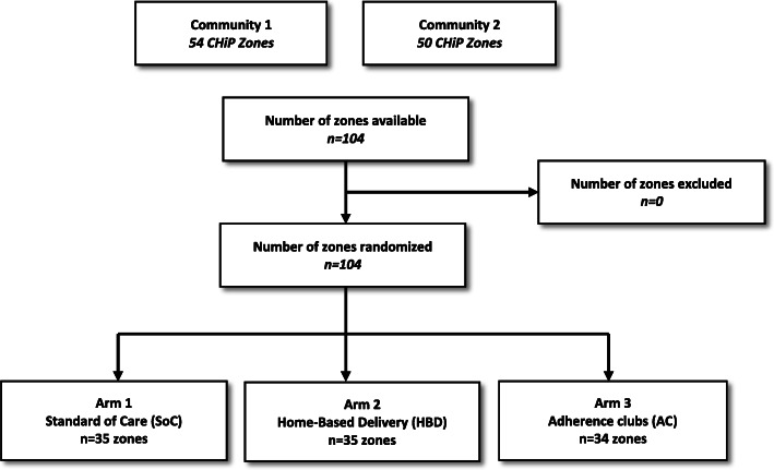 Methods: A three-arm cluster randomized non-inferiority trial, nested in two urban HPTN 071 trial communities in Zambia, randomly allocated 104 zones to SoC (35), HBD (35), or AC (34). ART and adherence support were delivered 3-monthly at home (HBD), adherence clubs (AC), or clinic (SoC). Adult HIV+ patients defined as "stable" on ART were eligible for inclusion. The primary endpoint was the proportion of PLHIV with virological suppression (≤ 1000 copies HIV RNA/ml) at 12 months (± 3months) after study entry across all three arms. Viral load measurement was done at the routine government laboratories in accordance with national guidelines, annually. The study was powered to determine if either of the community-based interventions would yield a viral suppression rate drop compared to SoC of no more than 5% in its absolute value. Both community-based interventions were delivered by community HIV providers (CHiPs). An additional qualitative study using observations, interviews with PLHIV, and FGDs with community HIV providers was nested in this study to complement the quantitative data.