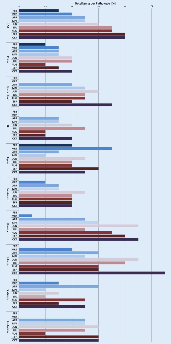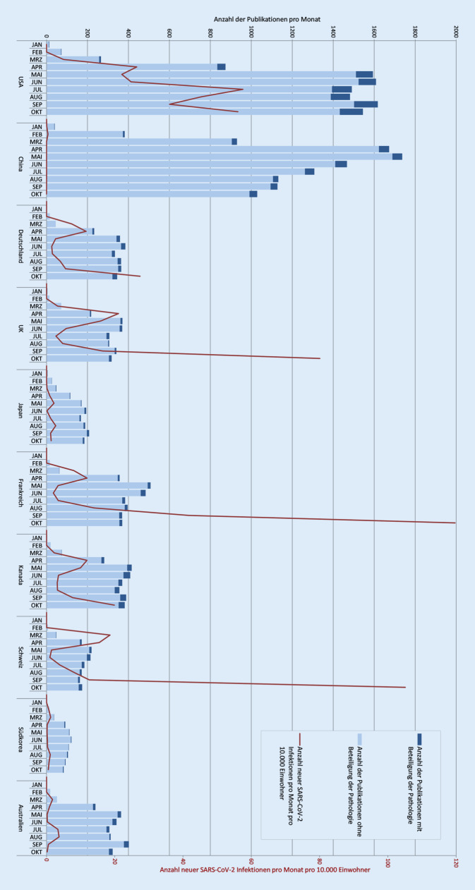 Fragestellung: Die Entwicklung der Publikationsaktivität im Verlauf der COVID-19-Pandemie im internationalen Vergleich sowie in Bezug auf lokale Infektionszahlen und die Beteiligung des Fachgebiets der Pathologie.