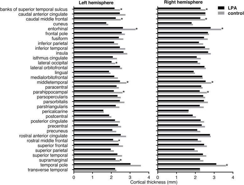 Methods: Thicknesses of all cortical regions were measured from brain magnetic resonance images using an automated command on Freesurfer software. Cortical thickness of the LPA and control groups were compared by two methods: 1) using a general linear model (GLM) in SPSS software; and 2) using a vertex-by-vertex GLM, performed with Freesurfer's QDEC interface.