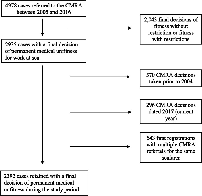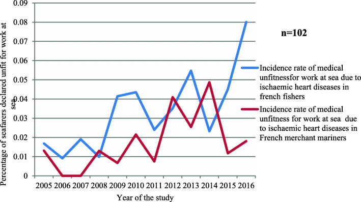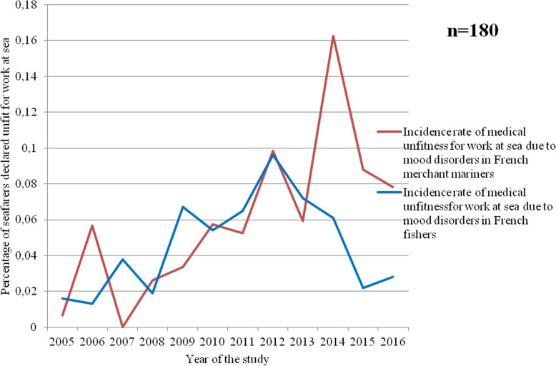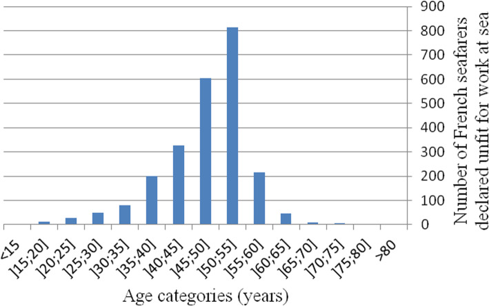Results: In all, 2392 seafarers were declared unfit for work at sea. This represents a permanent medical unfitness for work at sea incidence rate of below 1% for all French seafarers examined for medical fitness between 2005 and 2016. The average age of the population of unfit seafarers was 48. The average time spent at sea before being declared unfit for work at sea was 15.5 years. Sixty-seven percent of the seafarers declared unfit had been working in the fishing sector. The main reasons for deciding permanent unfitness for work at sea were: rheumatological conditions associated specifically with the spine; injuries relating to accidents or other external causes, mostly affecting the upper limbs; mental and behavioural disorders, including mood disorders and particularly addictions; and diseases of the circulatory system, namely coronopathies. The incidence rate of medical unfitness for work at sea was seen to increase between 2005 and 2016, but a decrease due to the dilution effect was noted in 2015.
