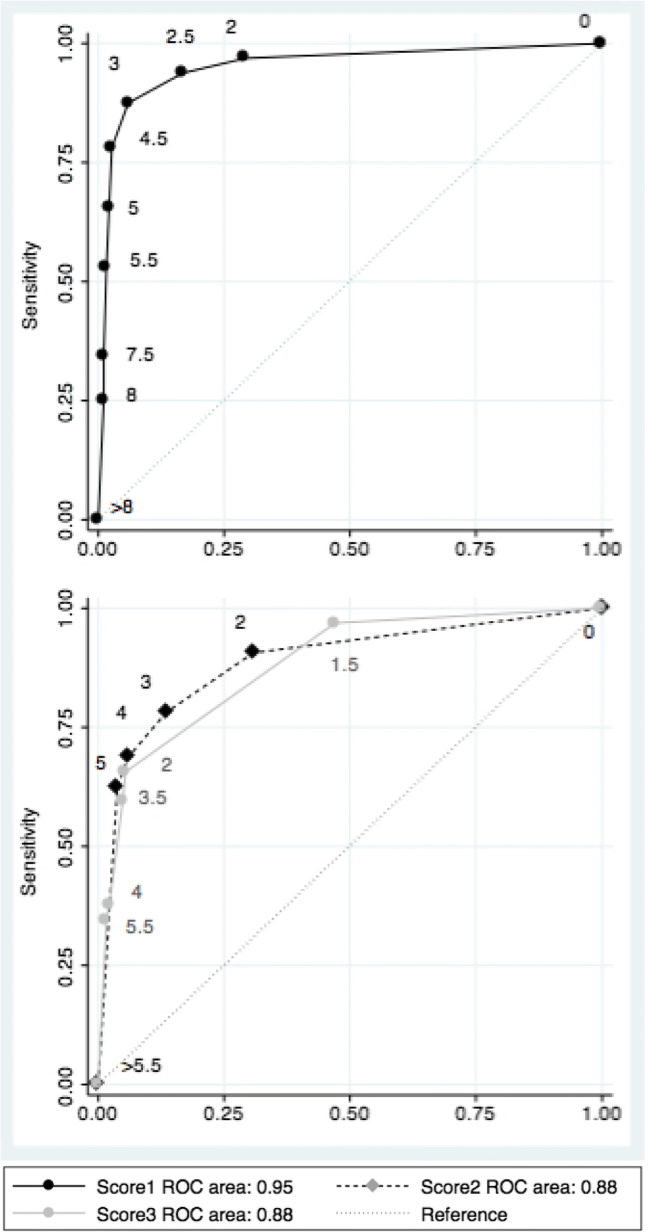 Results: The AL-O-A score ("abnormal or fluctuating ALertness, temporospatial Orientation and off-target Answers") showed excellent apparent (AUC 0.95 (95% CI 0.91-0.99)) and optimism-corrected discrimination (AUC 0.92 (95% CI 0.89-0.96)). It performed equally well in subgroups with and without cognitive impairment (AUC 0.93 (95% CI 0.88-0.99) vs 0.92 (95% CI 0.80-0.99)); in men and women (AUC 0.96 (95% CI 0.94-0.99) vs 0.95 (95% CI 0.89-0.99)); and in patients younger and older than 75 years old (AUC 0.98 (95% CI 0.95-0.99) vs 0.93 (95% CI 0.87-0.99)).