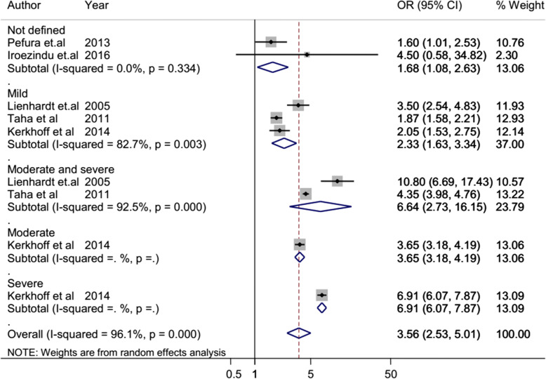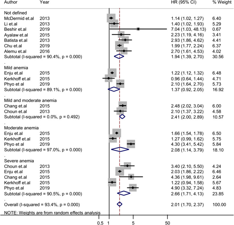 Results: A total of 17 articles with a 215,294 study participants were included in the analysis. The odd of tuberculosis among anemic patients was 3.56 (95% CI 2.53-5.01) times higher than non-anemic patients. The cohort studies showed that the HR of tuberculosis was 2.01 (95% CI 1.70-2.37) times higher among anemic patients than non-anemic patients. The hazard of tuberculosis also increased with anemia severity (HR 1.37 (95% CI 0.92-2.05), 2.08 (95% CI 1.14-3.79), and 2.66 (95% CI 1.71-4.13) for mild, moderate, and severe anemia, respectively).