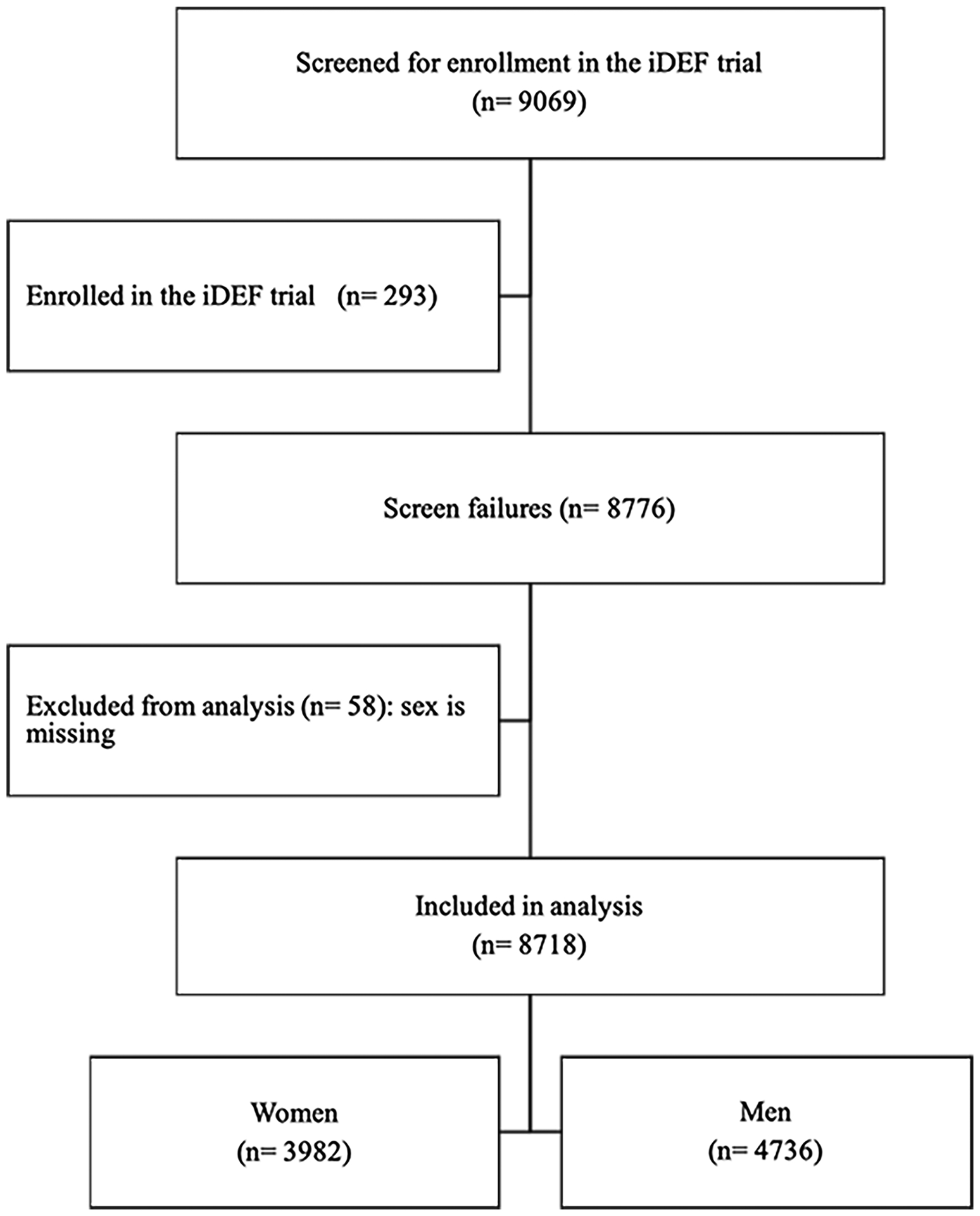 Results: A total of 38.2% of participants in iDEF were women. Three thousand nine hundred eighty-two women (45.7%) and 4736 men (54.3%) were screen failures (P<0.0001). Similar proportions of women (1.28%) and men (1.73%) were excluded due to inability to obtain consent (P=0.1). Patients or families declined participation in 1.26% of women versus 1.31% of men (P=0.9). More women than men failed screening because of age>80 (22.40% versus 12.61%; adjusted P=0.0007) and preexisting do-not-resuscitate/do-not-intubate (3.69% versus 2.83%; adjusted P=0.067).