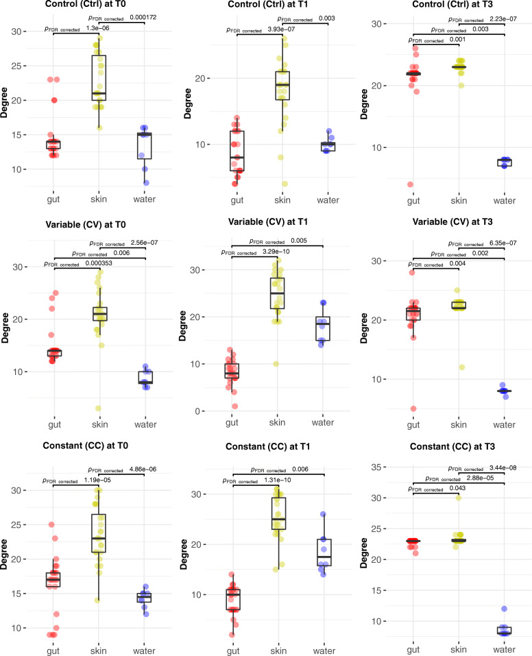 Results: After 30 days, constant and gradual selection regimes drove a significant alpha diversity increase for both skin and gut microbiota. In the skin, pervasive negative correlations between taxa in both selection regimes in addition to the taxonomic convergence with the environmental bacterial community, suggest a loss of colonisation resistance resulting in the dysbiosis of yellow perch microbiota. Furthermore, the network connectivity in gut microbiome was exclusively maintained by rare (low abundance) OTUs, while most abundant OTUs were mainly composed of opportunistic invaders such as Mycoplasma and other genera related to fish pathogens such as Flavobacterium. Finally, the mathematical modelling of community assembly using both non-linear least squares models (NLS) based estimates of migration rates and normalized stochasticity ratios (NST) based beta-diversity distances suggested neutral processes drove by taxonomic drift in host and water communities for almost all treatments. The NLS models predicted higher demographic stochasticity in the cadmium-free host and water microbiomes, however, NST models suggested higher ecological stochasticity under perturbations.