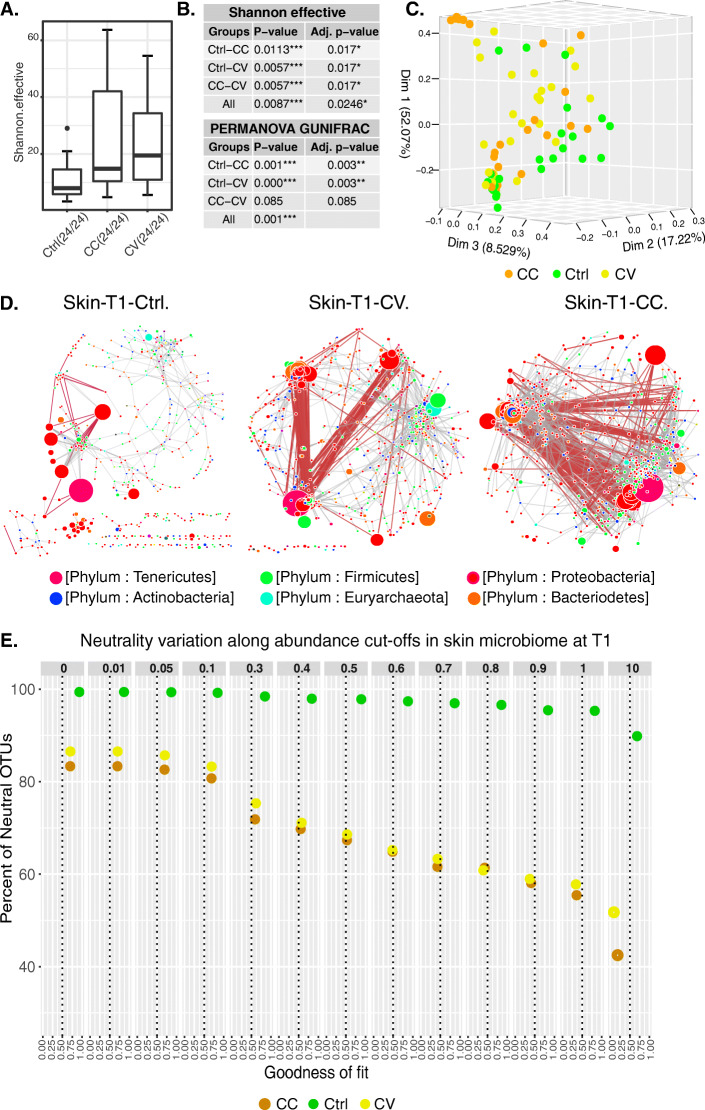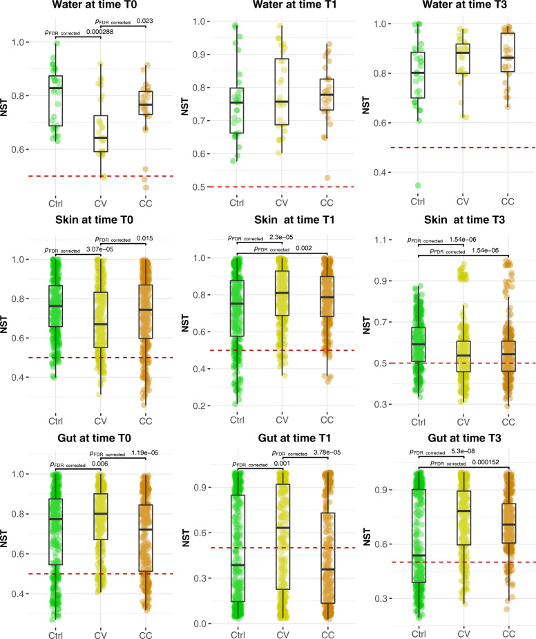 Conclusions: Neutral models agree that water and host-microbiota assembly promoted by rare taxa have evolved predominantly under neutral processes with potential involvement of deterministic forces sourced from host filtering and cadmium selection. The early signals of perturbations in the skin microbiome revealed antagonistic interactions by a preponderance of negative correlations in the co-abundance networks. Our findings enhance our understanding of community assembly host-associated and free-living under anthropogenic selective pressure.