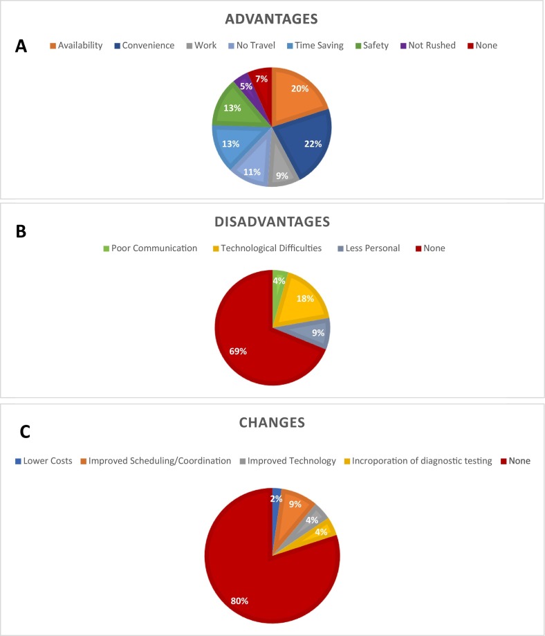 Results: Twenty-nine participants (64.4%) had audio-video visits while 16 (35.6%) had audio visits. 36 (80%) patients stated that their needs were met during their telemedicine visit while 32 (71.1%) patients felt that nothing was missed or not addressed during the virtual visit. The most commonly cited advantage to telemedicine visits was convenience (22.2%) and provider availability (20.0%). While most participants did not disclose a disadvantage to a virtual visit besides the lack of a physical exam (68.9%), the most commonly cited disadvantage to a virtual visit was technological difficulties (17.8%).