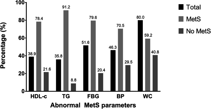 Results: According to the Harmonized criteria, the metabolic syndrome prevalence was 50.5%. Among those with metabolic syndrome, the most prevalent abnormal metabolic components were triglycerides (91.2%), fasting blood glucose (79.6%) and HDL-c level (78.4%). Except for total cholesterol and LDL-c, all other metabolic syndrome components were significantly different (p < 0.05) between those with and without metabolic syndrome. Significant differences between metabolic syndrome and non-metabolic syndrome groups were found for weight, BMI, waist circumference, body fat percentage and cancer stages (p < 0.05). However, no significant relationship was reported between sociodemographic, clinical parameters and metabolic syndrome among breast cancer survivors in this study.