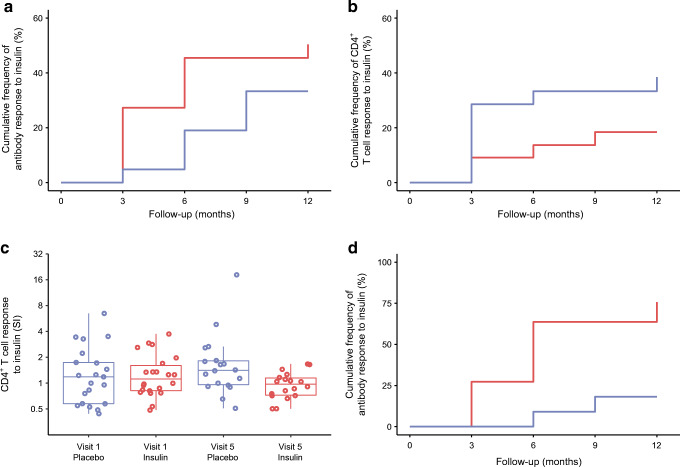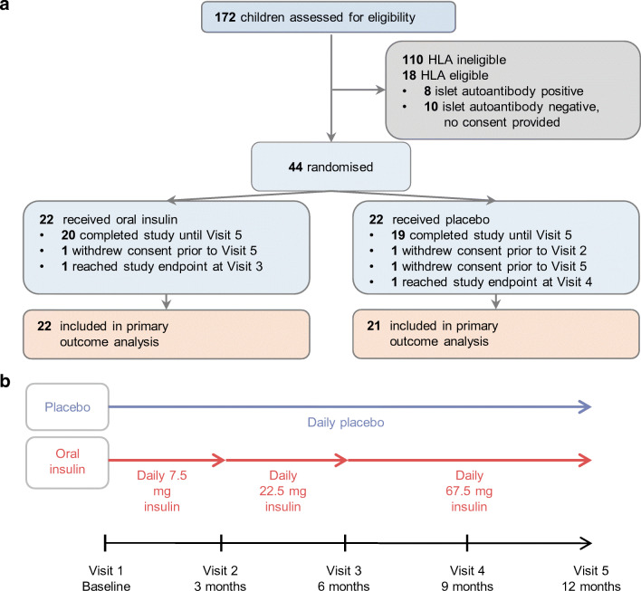 Methods: A phase I/II randomised controlled trial was performed in a single clinical study centre in Germany. Participants were 44 islet autoantibody-negative children aged 6 months to 2.99 years who had a first-degree relative with type 1 diabetes and a susceptible HLA DR4-DQ8-containing genotype. Children were randomised 1:1 to daily oral insulin (7.5 mg with dose escalation to 67.5 mg) or placebo for 12 months using a web-based computer system. The primary outcome was immune efficacy pre-specified as induction of antibody or T cell responses to insulin and measured in a central treatment-blinded laboratory.