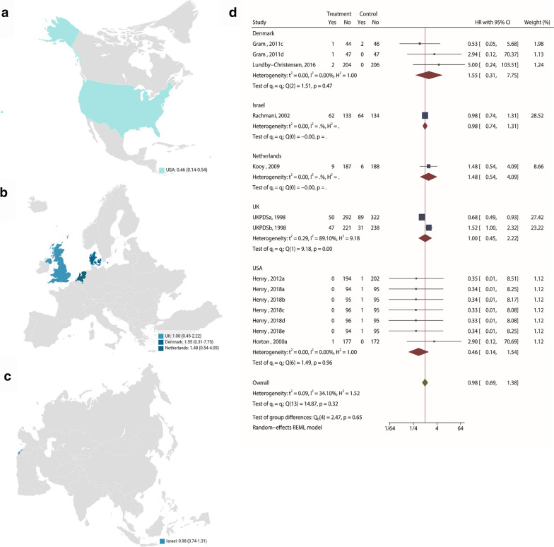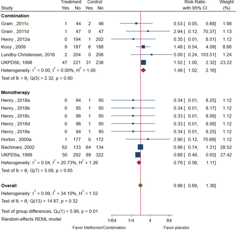 Results: We identified 29 studies that randomly assigned patients with 371 all-cause and 227 cardiovascular death events. Compared with untreated T2DM patients, metformin-treated patients was not associated with lower risk of all-cause mortality (RR: 0.98; 95%CI: 0.69-1.38; P = 0.90), cardiovascular mortality (RR: 1.13; 95% CI: 0.60, 2.15; P = 0.70), macrovascular events (RR: 0.87; 95%CI: 0.70-1.07; P = 0.19), heart failure (RR: 1.02; 95% CI:0.61-1.71; P = 0.95), and microvascular events (RR: 0.78; 95% CI:0.54-1.13; P = 0.19). Combination of metformin with another hypoglycemic drug was associated with higher risk of all-cause mortality (RR: 1.49; 95% CI: 1.02, 2.16) and cardiovascular mortality (RR: 2.21; 95% CI: 1.22, 4.00) compared with hypoglycemic drug regimens with no metformin.