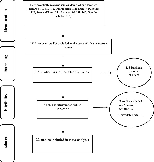 Methods: To identify and select relevant articles, the SID, MagIran, IranMedex, IranDoc, Google Scholar, Cochrane, Embase, ScienceDirect, Scopus, PubMed, and Web of Science (WoS) databases were searched without a lower time limit and until April 2020. The random effects model was used to perform the analysis, and the heterogeneity of studies was assessed using the I2 index. Data were analyzed within the Comprehensive Meta-Analysis (Version 2) software.