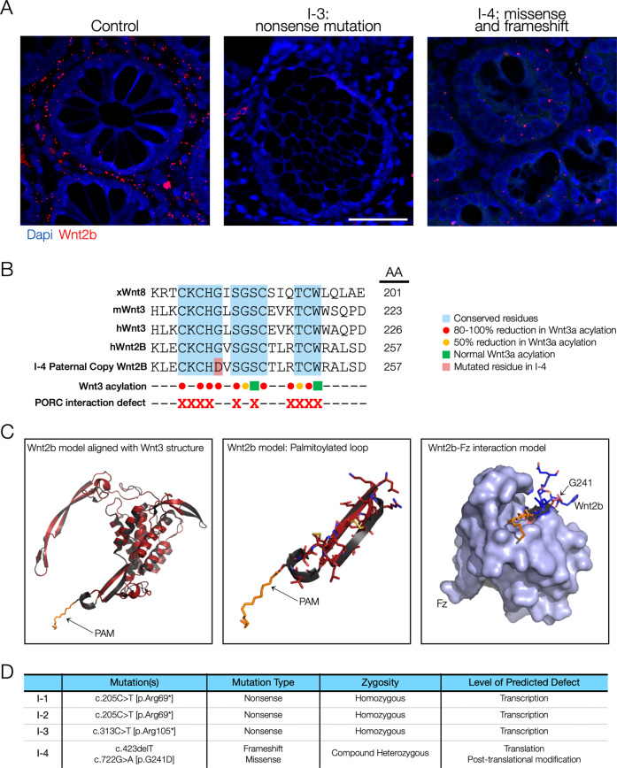 WNT2B is a member of the Wnt family, a group of signal transduction proteins involved in embryologic development and stem cell renewal and maintenance. We recently reported homozygous nonsense variants in WNT2B in three individuals with severe, neonatal-onset diarrhea, and intestinal failure. Here we present a fourth case, from a separate family, with neonatal diarrhea associated with novel compound heterozygous WNT2B variants. One of the two variants was a frameshift variant (c.423del [p.Phe141fs]), while the other was a missense change (c.722 G > A [p.G241D]) that we predict through homology modeling to be deleterious, disrupting post-translational acylation. This patient presented as a neonate with severe diet-induced (osmotic) diarrhea and growth failure resulting in dependence on parenteral nutrition. Her gastrointestinal histology revealed abnormal cellular architecture particularly in the stomach and colon, including oxyntic atrophy, abnormal distribution of enteroendocrine cells, and a paucity of colonic crypt glands. In addition to her gastrointestinal findings, she had bilateral corneal clouding and atypical genital development later identified as a testicular 46,XX difference/disorder of sexual development. Upon review of the previously reported cases, two others also had anterior segment ocular anomalies though none had atypical genital development. This growing case series suggests that variants in WNT2B are associated with an oculo-intestinal (and possibly gonadal) syndrome, due to the protein's putative involvement in multiple developmental and stem cell maintenance pathways.