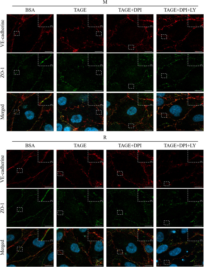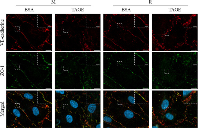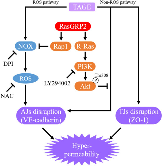 Advanced glycation end-products (AGEs) are formed by the non-enzymatic reaction of sugars and proteins. Among the AGEs, glyceraldehyde-derived toxic AGEs (TAGE) are associated with various diseases, including diabetic complications such as diabetic retinopathy (DR). The risk of developing DR is strongly associated with poor glycemic control, which causes AGE accumulation and increases AGE-induced vascular permeability. We previously reported that Ras guanyl nucleotide releasing protein 2 (RasGRP2), which activates small G proteins, may play an essential role in the cell response to toxicity when exposed to various factors. However, it is not known whether RasGRP2 prevents the adverse effects of TAGE in vascular endothelial cells. This study observed that TAGE enhanced vascular permeability by disrupting adherens junctions and tight junctions via complex signaling, such as ROS and non-ROS pathways. In particular, RasGRP2 protected adherens junction disruption, thereby suppressing vascular hyper-permeability. These results indicate that RasGRP2 is an essential protective factor of vascular permeability and may help develop novel therapeutic strategies for AGE-induced DR.