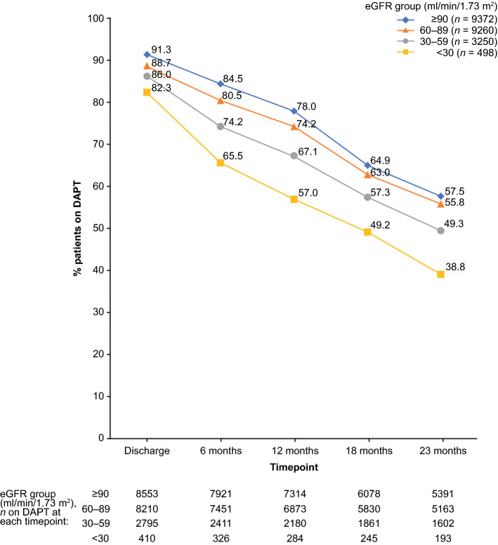 Results: Among 22,380 patients with available data, eGFR < 60 mL/min/1.73 m2 was observed in 16.7%. Patients with poorer renal function were older, were at greater cardiovascular risk, and had more prior cardiovascular disease and bleeding. Patients with CKD underwent fewer cardiovascular interventions and had more in-hospital cardiovascular and bleeding events. Dual antiplatelet therapy was less likely at discharge in patients with eGFR < 30 (82.3%) than in those with ≥ 90 (91.3%) mL/min/1.73 m2 and declined more sharply during follow-up in patients with low eGFR (p < 0.0001). An adjusted proportional hazards model showed that patients with lower eGFR levels had a higher risk of cardiovascular events and bleeding.