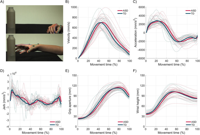 Failure to develop prospective motor control has been proposed to be a core phenotypic marker of autism spectrum disorders (ASD). However, whether genuine differences in prospective motor control permit discriminating between ASD and non-ASD profiles over and above individual differences in motor output remains unclear. Here, we combined high precision measures of hand movement kinematics and rigorous machine learning analyses to determine the true power of prospective movement data to differentiate children with autism and typically developing children. Our results show that while movement is unique to each individual, variations in the kinematic patterning of sequential grasping movements genuinely differentiate children with autism from typically developing children. These findings provide quantitative evidence for a prospective motor control impairment in autism and indicate the potential to draw inferences about autism on the basis of movement kinematics.