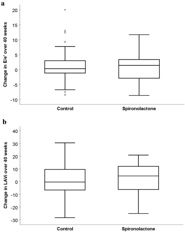 Heart failure with preserved ejection fraction (HFpEF) is highly prevalent in patients on maintenance haemodialysis (HD) and lacks effective treatment. We investigated the effect of spironolactone on cardiac structure and function with a specific focus on diastolic function parameters. The MiREnDa trial examined the effect of 50 mg spironolactone once daily versus placebo on left ventricular mass index (LVMi) among 97 HD patients during 40 weeks of treatment. In this echocardiographic substudy, diastolic function was assessed using predefined structural and functional parameters including E/e'. Changes in the frequency of HFpEF were analysed using the comprehensive 'HFA-PEFF score'. Complete echocardiographic assessment was available in 65 individuals (59.5 ± 13.0 years, 21.5% female) with preserved left ventricular ejection fraction (LVEF > 50%). At baseline, mean E/e' was 15.2 ± 7.8 and 37 (56.9%) patients fulfilled the criteria of HFpEF according to the HFA-PEFF score. There was no significant difference in mean change of E/e' between the spironolactone group and the placebo group (+ 0.93 ± 5.39 vs. + 1.52 ± 5.94, p = 0.68) or in mean change of left atrial volume index (LAVi) (1.9 ± 12.3 ml/m2 vs. 1.7 ± 14.1 ml/m2, p = 0.89). Furthermore, spironolactone had no significant effect on mean change in LVMi (+ 0.8 ± 14.2 g/m2 vs. + 2.7 ± 15.9 g/m2; p = 0.72) or NT-proBNP (p = 0.96). Treatment with spironolactone did not alter HFA-PEFF score class compared with placebo (p = 0.63). Treatment with 50 mg of spironolactone for 40 weeks had no significant effect on diastolic function parameters in HD patients.The trial has been registered at clinicaltrials.gov (NCT01691053; first posted Sep. 24, 2012).