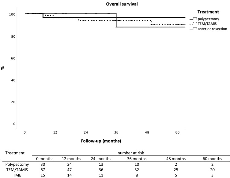 Results: In total, 536 patients with rectal cancer were identified, of which 112 were included based on their pre-operative identification at the MDT on the basis that they had node-negative early rectal cancer. Among these, 30 patients (27%) had the lesion excised by flexible endoscopic polypectomy techniques (EMR/ESD), 67 (60%) underwent TEM/TAMIS and 15 (13%) had major surgery. There were no differences in patient demographics between the three groups except for TEM/TAMIS patients being more likely to be referred from another hospital (p < 0.001) and they were less active (WHO performance status p = 0.04). There were no significant differences in overall survival rates and cancer-specific survival between the three treatment groups. The 5-year overall survival rate for endoscopic polypectomy, TEM/TAMIS or major resection was 96% versus 90% and 88%, respectively (p = 0.89). The 5- year cancer-specific survival rate was 96%, versus 96% and 100%, respectively (p = 0.74).
