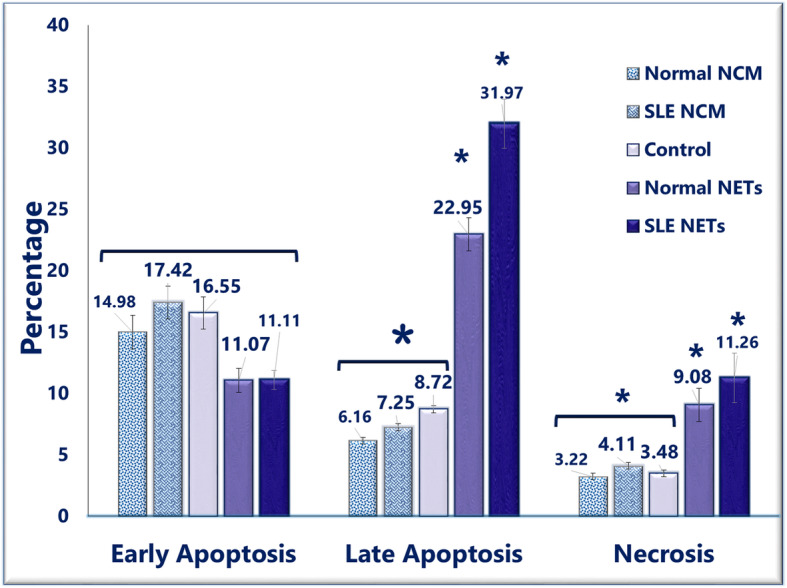 Conclusion: The decreased neutrophil viability was not due to the increase in apoptosis; rather, it was because of the augmentation of other inflammatory cell-death modes. The upregulation of CD11b implies that NET causes neutrophils to more actively contribute to inflammation. The increased oxidative burst capacity of neutrophils can play a double role in inflammation. Overall, the effects induced by NET on neutrophils help prolong inflammation; accordingly, the NET collected from SLE patients is stronger than the NET from healthy individuals.