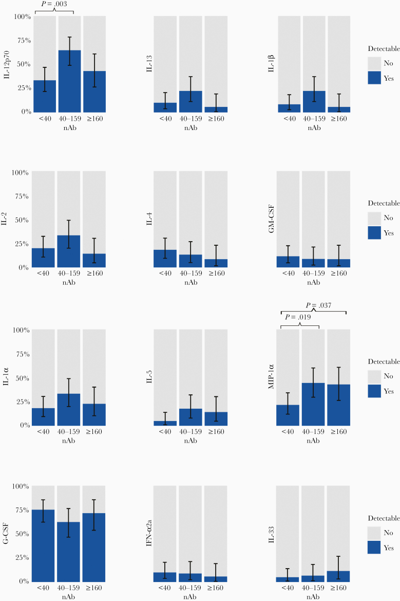 Methods: A cross-sectional study was conducted among 20 prepandemic healthy blood donors without SARS-CoV-2 infection and 140 eligible CCP donors with confirmed SARS-CoV-2 infection. Electrochemiluminescence detection-based multiplexed sandwich immunoassays were used to quantify plasma cytokine and chemokine concentrations (n = 35 analytes). A SARS-CoV-2 microneutralization assay was also performed. Differences in the percentage of detection and distribution of cytokine and chemokine concentrations were examined by categorical groups using Fisher's exact and Wilcoxon rank-sum tests, respectively.