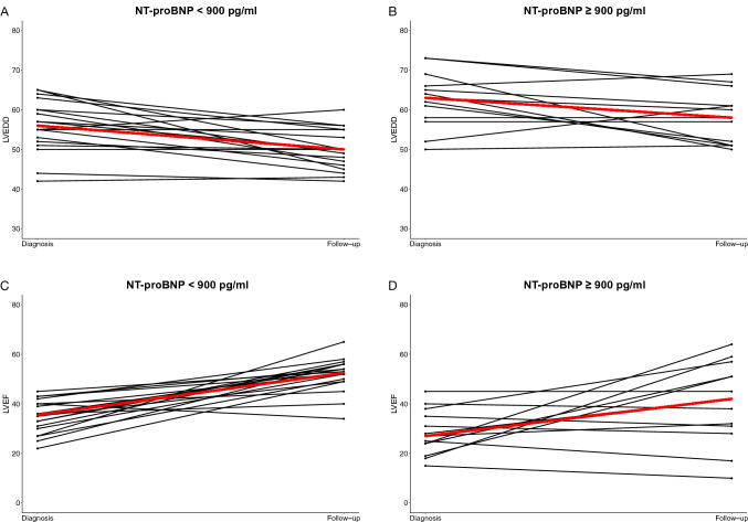 Results: This study of 35 women with PPCM (mean age 30.0 ± 5.9 years) had a median NT-proBNP of 834.7 pg/ml (IQR 571.2-1840.5) at baseline. Within the first year of follow-up, 51.4% of the cohort recovered their LV dimensions (LVEDD < 55 mm) and systolic function (LVEF > 50%). Women without LV recovery presented with higher NT-proBNP at baseline. Multivariable regression analyses demonstrated that NT-proBNP of ≥ 900 pg/ml at the time of diagnosis was predictive of failure to recover LVEDD (OR 0.22, 95% CI 0.05-0.95, P = 0.043) or LVEF (OR 0.20 [95% CI 0.04-0.89], p = 0.035) at follow-up.