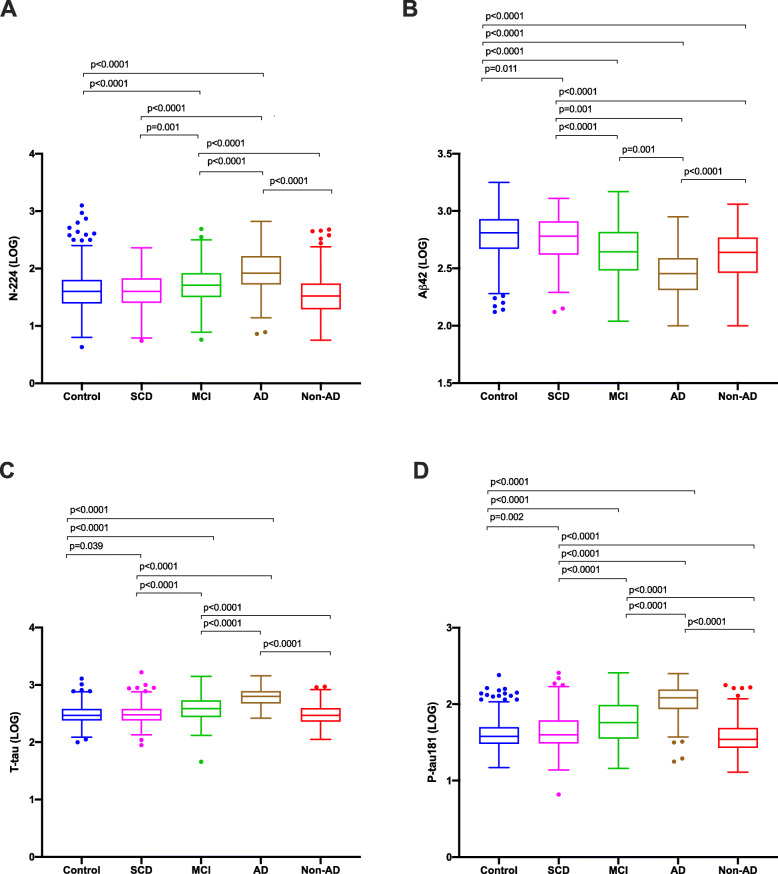 Conclusions: N-224 tau can distinguish AD subjects from SCD and can discriminate subgroups of non-AD dementias from AD. Therefore, N-224 may be a useful addition to the tau biomarker toolbox for the study of tau species in CSF and for better understanding disease pathogenesis.