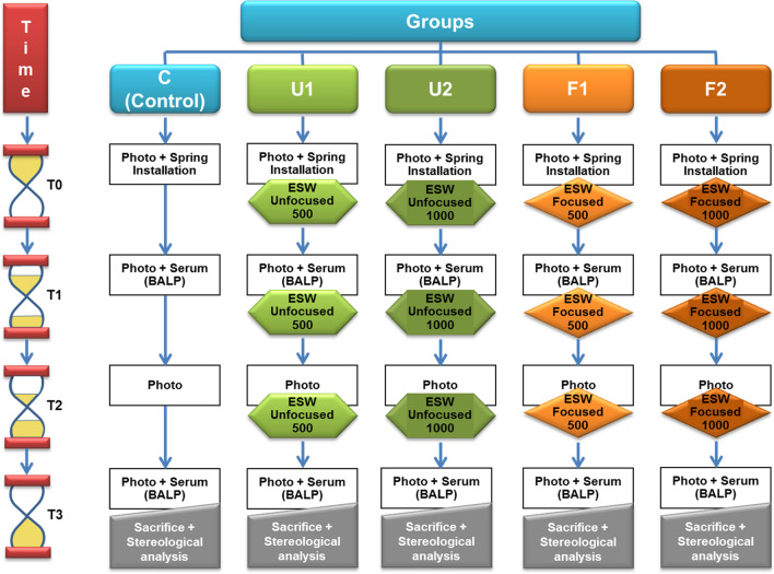 The purpose of this animal study is to investigate the quantitative effects of extracorporeal shock waves applied at two different impulses and with two different applicators on orthodontic tooth movement. Thirty-five New Zealand rabbits were randomly divided into five groups (n = 7): the four experimental extracorporeal shock wave groups-focused/500 impulses, focused/1000 impulses, unfocused/500 impulses, and unfocused/1000 impulses-and the control group. Orthodontic tooth movement was achieved by application of reciprocal force between two maxillary incisors. In the experimental groups, animals received 500 or 1000 impulses of extracorporeal shock waves at 0.19 mJ/mm2 with focused or unfocused applicators depending on the group to which they belonged. These experiments were conducted on days 0, 7, and 14. Orthodontic tooth movement was measured with 0.01 mm accuracy at one-week intervals. On days 7 and 21, the bone-specific alkaline phosphatase levels were measured from blood samples. After 21 days, the animals were sacrificed and the area between the two maxillary incisors was stereologically examined. Orthodontic tooth movement in the focused/500 impulses and focused/1000 impulses groups was significantly increased compared to the control group. A significant difference in bone-specific alkaline phosphatase levels between the unfocused/500 impulses and control groups was found at 21st day. Stereological analysis showed that there were significant increases of the formation of new bone, connective tissue, and vessels in the experimental groups. The application of extracorporeal shock waves, especially with a focused applicator, could accelerate orthodontic tooth movement.