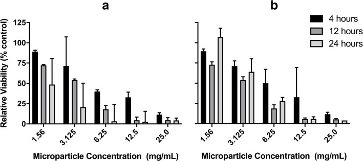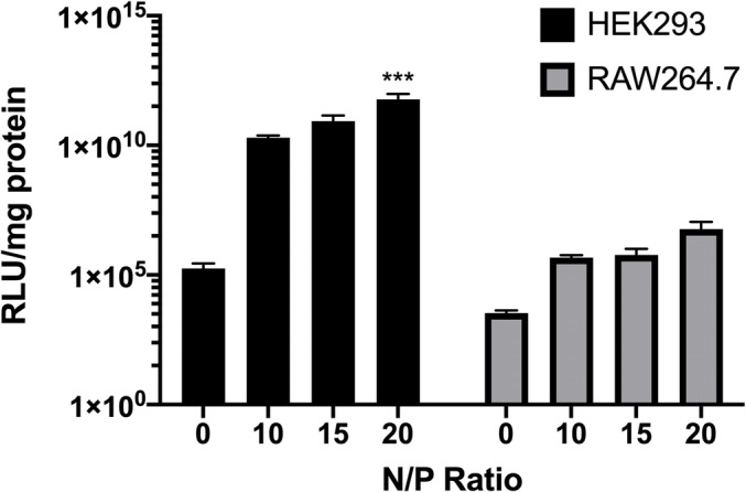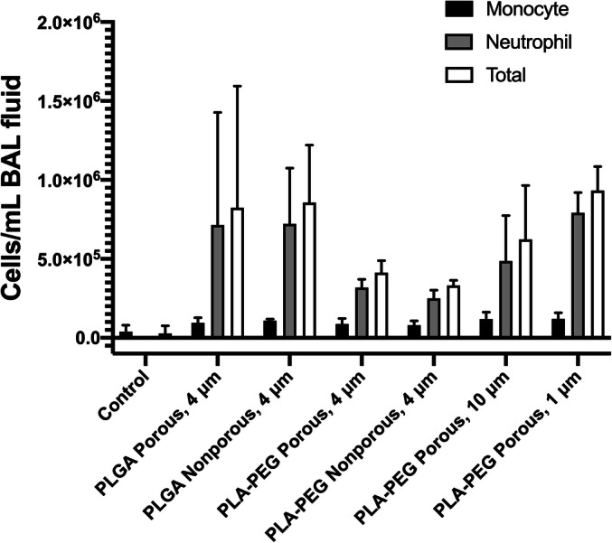 Encapsulating genetic material into biocompatible polymeric microparticles is a means to improving gene transfection while simultaneously decreasing the tendency for inflammatory responses; and can be advantageous in terms of delivering material directly to the lungs via aerosolization for applications such as vaccinations. In this study, we investigated the advantages of using polymeric microparticles carrying the luciferase reporter gene in increasing transfection efficiency in the readily transfectable HEK293 cell line and the difficult to transfect RAW264.7 cell line. The results indicated that there was a limit to the ratio of nitrogen in polyethylenimine (PEI) to phosphate in DNA (N/P ratio) beyond which further increases in transgene expression no longer, or only marginally, occurred. Microparticles encapsulating PEI:DNA nanoplexes induced cellular toxicity in a dose-dependent manner. PEGylation increased transgene expression, likely related to enhanced degradation of particles. Furthermore, intra-tracheal instillation in rats allowed us to investigate the inflammatory response in the lung as a function of PEGylation, porosity, and size. Porosity did not influence cell counts in bronchoalveolar lavage fluid in the absence of PEG, but in particles containing PEG, non-porous particles recruited fewer inflammatory cells than their porous counterparts. Finally, both 1 μm and 10 μm porous PLA-PEG particles recruited more neutrophils than 4 μm particles. Thus, we have shown that PEGylation and lack of porosity are advantageous for faster release of genetic cargo from microparticles and a reduced inflammatory response, respectively.