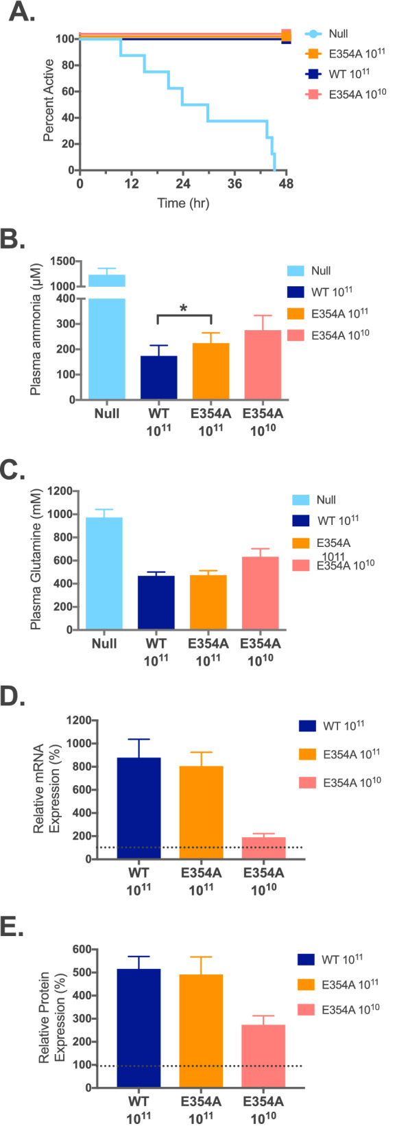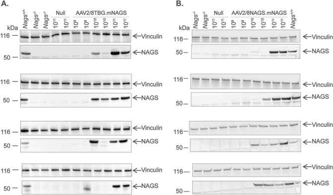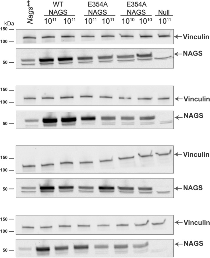 The urea cycle protects the central nervous system from ammonia toxicity by converting ammonia to urea. N-acetylglutamate synthase (NAGS) catalyzes formation of N-acetylglutamate, an essential allosteric activator of carbamylphosphate synthetase 1. Enzymatic activity of mammalian NAGS doubles in the presence of L-arginine, but the physiological significance of NAGS activation by L-arginine has been unknown. The NAGS knockout (Nags-/-) mouse is an animal model of inducible hyperammonemia, which develops hyperammonemia without N-carbamylglutamate and L-citrulline supplementation (NCG + Cit). We used adeno associated virus (AAV) based gene transfer to correct NAGS deficiency in the Nags-/- mice, established the dose of the vector needed to rescue Nags-/- mice from hyperammonemia and measured expression levels of Nags mRNA and NAGS protein in the livers of rescued animals. This methodology was used to investigate the effect of L-arginine on ureagenesis in vivo by treating Nags-/- mice with AAV vectors encoding either wild-type or E354A mutant mouse NAGS (mNAGS), which is not activated by L-arginine. The Nags-/- mice expressing E354A mNAGS were viable but had elevated plasma ammonia concentration despite similar levels of the E354A and wild-type mNAGS proteins. The corresponding mutation in human NAGS (NP_694551.1:p.E360D) that abolishes binding and activation by L-arginine was identified in a patient with NAGS deficiency. Our results show that NAGS deficiency can be rescued by gene therapy, and suggest that L-arginine binding to the NAGS enzyme is essential for normal ureagenesis.