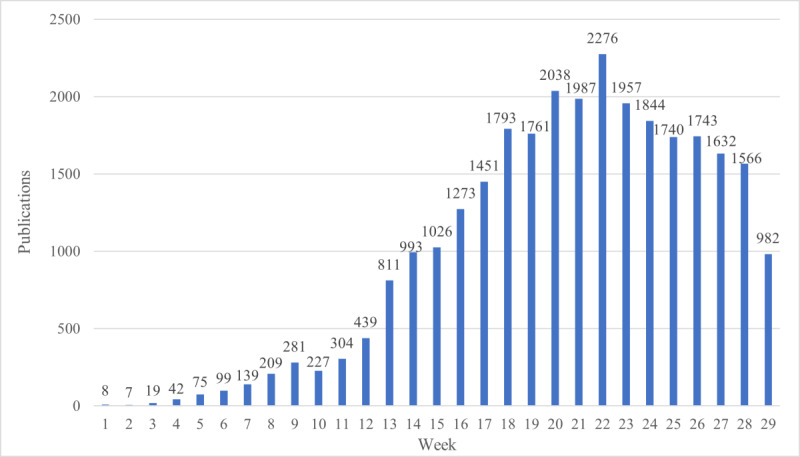 Results: Of the 196,630 publications retrieved from the database, we included 28,904 in our analysis. The mean number of weekly publications was 990 (SD 789.3). The country that published the highest number of COVID-19-related articles was China (2950/17,270, 17.08%). The highest number of articles were published in bioRxiv. Lei Liu affiliated with the Southern University of Science and Technology in China published the highest number of articles (n=46). Based on titles and abstracts alone, we were able to identify 1515 surveys, 733 systematic reviews, 512 cohort studies, 480 meta-analyses, and 362 randomized control trials. We identified 19 different topics covered among the publications reviewed. The most dominant topic was public health response, followed by clinical care practices during the COVID-19 pandemic, clinical characteristics and risk factors, and epidemic models for its spread.