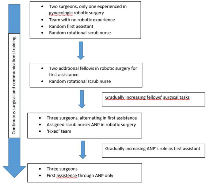 Main aim of this study is to assess the effect of a structured, interdisciplinary, surgical, team-training protocol in robotic gynecologic surgery, with the gradual integration of an advanced nurse practitioner. Data from all robotic surgical procedures were prospectively acquired. The surgical team consisted of one experienced surgeon and two surgical fellows and the scrub nurse team from three advance nurse practitioners, specialized in robotic surgery. The training was performed in a four-phase manner over 4 years and included theoretical training, hands-on training and team-communication skills enhancement. Scrub nurses increasingly adopted an active role during surgery. For a period of 4 years, 175 patients could be included in the analysis. All of them underwent a robotic gynecologic procedure. Mean docking time decreased from 45.3 to 27.3 min (p < 0.001), mean operating time from 235 to 179 min (p = 0.0071) and costs per case from 17,891 to 14,731 Swiss Francs (p = 0.035). There were no statistically significant changes in perioperative complications and conversions to laparotomy. An interdisciplinary long-term training protocol for high specialized robotic surgery within a "fixed" team with the gradually addition of an advanced study nurse improves the efficacy of the procedure in terms of time and costs. Although the surgery is performed quicker, the same performance and quality of surgical care could be reached.