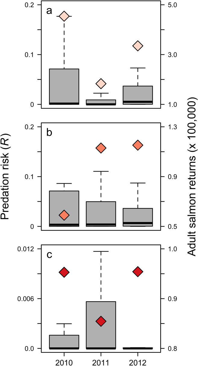 Predation mortality can influence the distribution and abundance of fish populations. While predation is often assessed using direct observations of prey consumption, potential predation can be predicted from co-occurring predator and prey densities under varying environmental conditions. Juvenile Pacific salmon Oncorhynchus spp. (i.e., smolts) from the Columbia River Basin experience elevated mortality during the transition from estuarine to ocean habitat, but a thorough understanding of the role of predation remains incomplete. We used a Holling type II functional response to estimate smolt predation risk based on observations of piscivorous seabirds (sooty shearwater [Ardenna griseus] and common murre [Uria aalge]) and local densities of alternative prey fish including northern anchovy (Engraulis mordax) in Oregon and Washington coastal waters during May and June 2010-2012. We evaluated predation risk relative to the availability of alternative prey and physical factors including turbidity and Columbia River plume area, and compared risk to returns of adult salmon. Seabirds and smolts consistently co-occurred at sampling stations throughout most of the study area (mean = 0.79 ± 0.41, SD), indicating that juvenile salmon are regularly exposed to avian predators during early marine residence. Predation risk for juvenile coho (Oncorhynchus kisutch), yearling Chinook salmon (O. tshawytscha), and subyearling Chinook salmon was on average 70% lower when alternative prey were present. Predation risk was greater in turbid waters, and decreased as water clarity increased. Juvenile coho and yearling Chinook salmon predation risk was lower when river plume surface areas were greater than 15,000 km2, while the opposite was estimated for subyearling Chinook salmon. These results suggest that plume area, turbidity, and forage fish abundance near the mouth of the Columbia River, all of which are influenced by river discharge, are useful indicators of potential juvenile salmon mortality that could inform salmonid management.