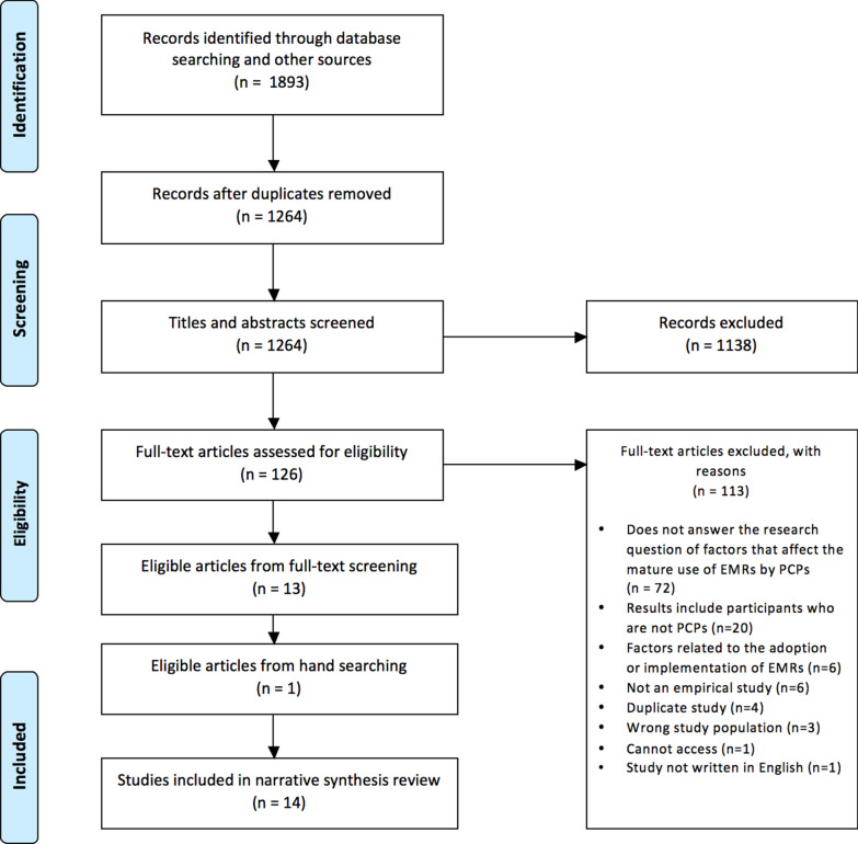 Results: Of the 1893 studies identified, 14 were included in this study. Reported factors that influenced PCPs' mature use of EMRs fell into one of the following 5 categories: technology, people, organization, resources, and policy. Concerns about the EMR system's functionality, lack of physician awareness of EMR functionality, limited physician availability to learn more about EMRs, the habitual use of successfully completing clinical tasks using only basic EMR features, business-oriented organizational objectives, lack of vendor training, limited resource availability, and lack of physician readiness were reported as barriers to PCPs' mature use of EMRs. The motivation of physicians, user satisfaction, coaching and peer mentoring, EMR experience, gender, physician perception, transition planning for changes in roles and work processes, team-based care, adequate technical support and training, sharing resources, practices affiliated with an integrated delivery system, financial incentives, and policies to increase EMR use all had a favorable impact on PCPs' use of advanced EMR features.