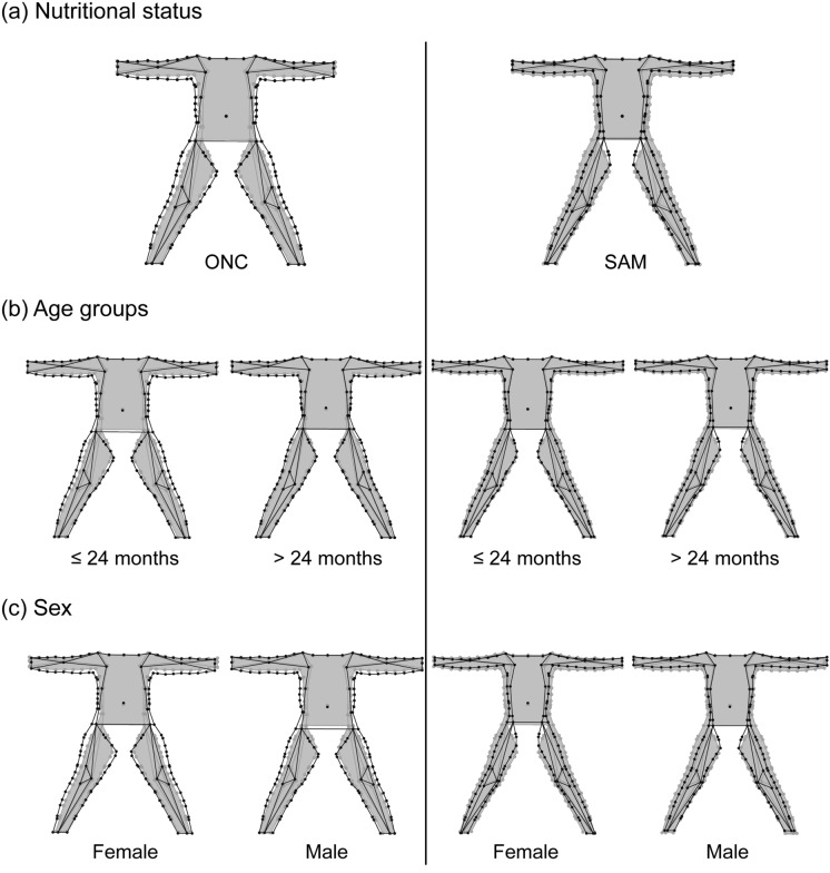 Current methods for infant and child nutritional assessment rely on anthropometric measurements, whose implementation faces technical challenges in low- and middle-income countries. Anthropometry is also limited to linear measurements, ignoring important body shape information related to health. This work proposes the use of 2D geometric morphometric techniques applied to a sample of Senegalese participants aged 6-59 months with an optimal nutritional condition or with severe acute malnutrition to address morphometric variations due to nutritional status. Significant differences in shape and size body changes were described according to nutritional status, resulting age, sex and allometric effect crucial factors to establish nutritional morphological patterns. The constructed discriminant functions exhibited the best classification rates in the left arm. A landmark-based template registering body shape could be useful to both assess acute malnutrition and better understand the morphological patterns that nutritional status promotes in children during their first 5 years of growth and development.