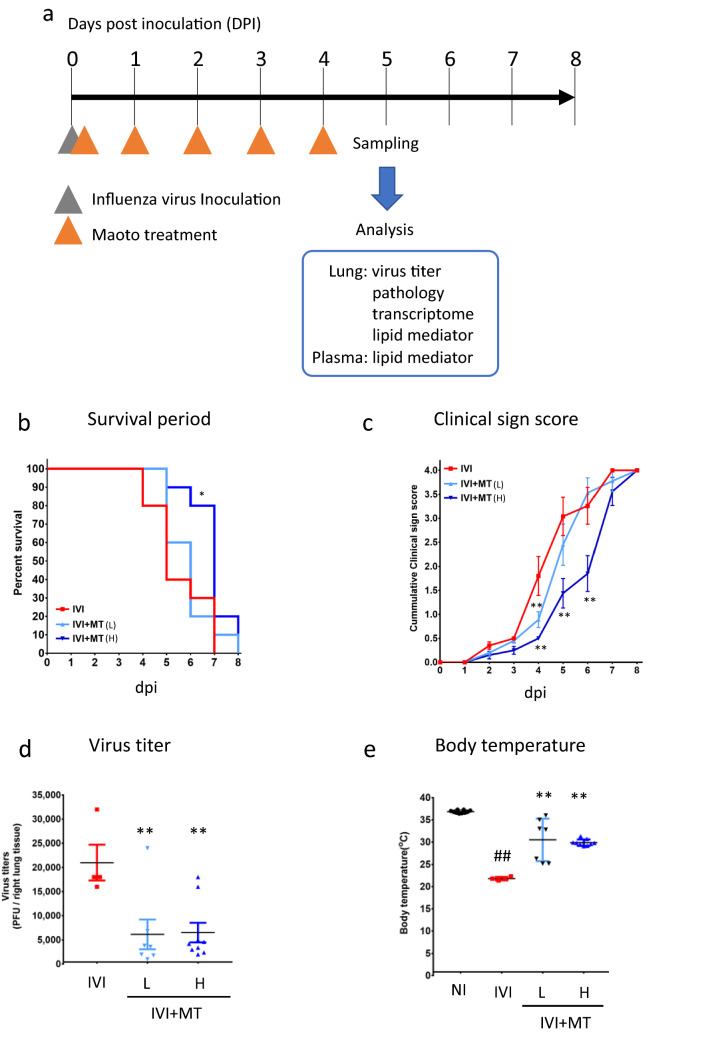 Maoto, a traditional kampo medicine, has been clinically prescribed for influenza infection and is reported to relieve symptoms and tissue damage. In this study, we evaluated the effects of maoto as an herbal multi-compound medicine on host responses in a mouse model of influenza infection. On the fifth day of oral administration to mice intranasally infected with influenza virus [A/PR/8/34 (H1N1)], maoto significantly improved survival rate, decreased viral titer, and ameliorated the infection-induced phenotype as compared with control mice. Analysis of the lung and plasma transcriptome and lipid mediator metabolite profile showed that maoto altered the profile of lipid mediators derived from ω-6 and ω-3 fatty acids to restore a normal state, and significantly up-regulated the expression of macrophage- and T-cell-related genes. Collectively, these results suggest that maoto regulates the host's inflammatory response by altering the lipid mediator profile and thereby ameliorating the symptoms of influenza.